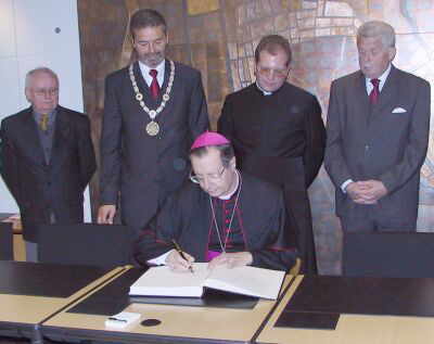 (Erzbischof Dr. Giovanni Lajolo beim Eintrag ins Goldene Buch (v. l.