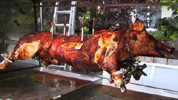 aus seinen Nüstern Grilldämpfe und Rauch aufsteigen.